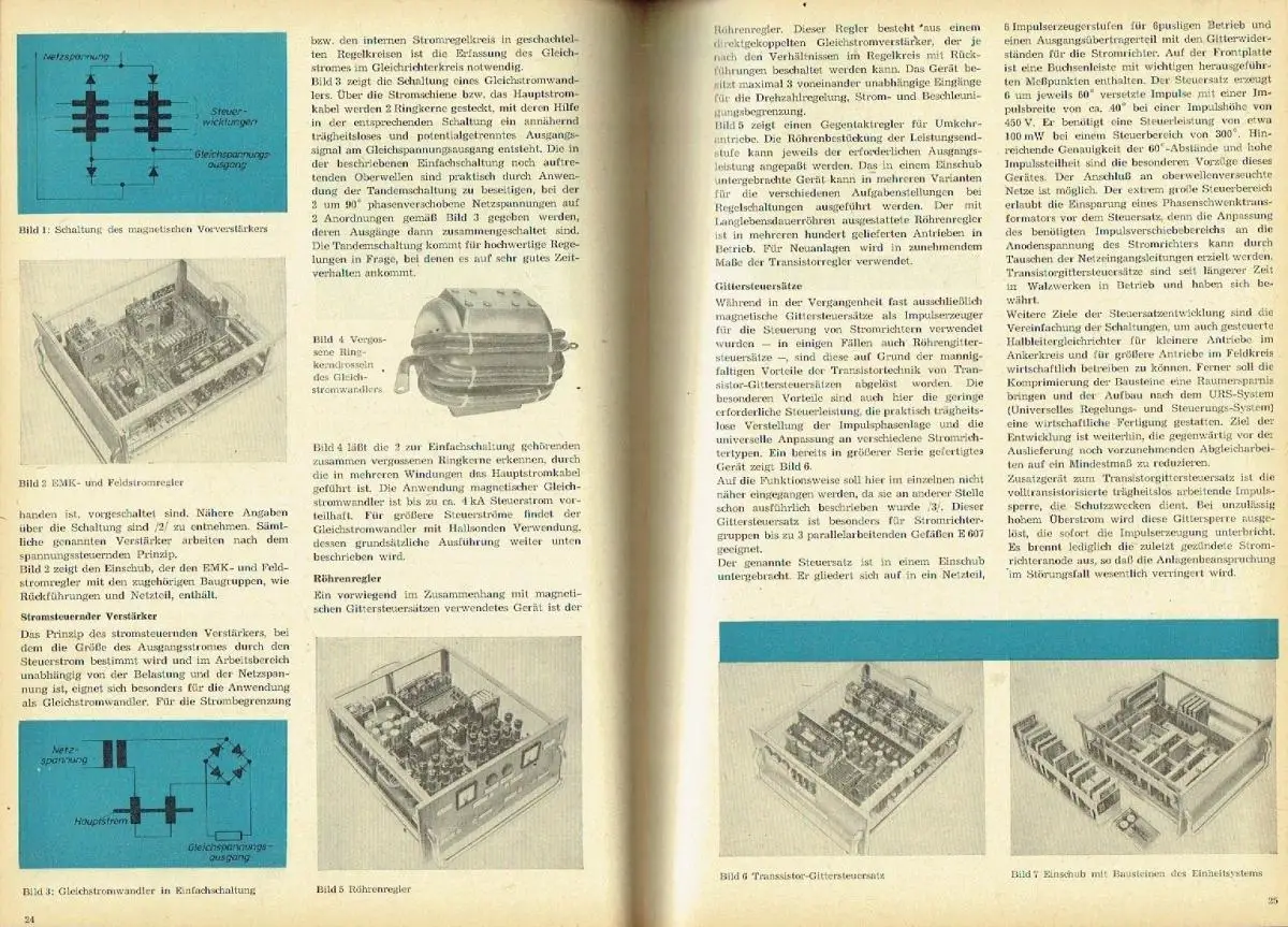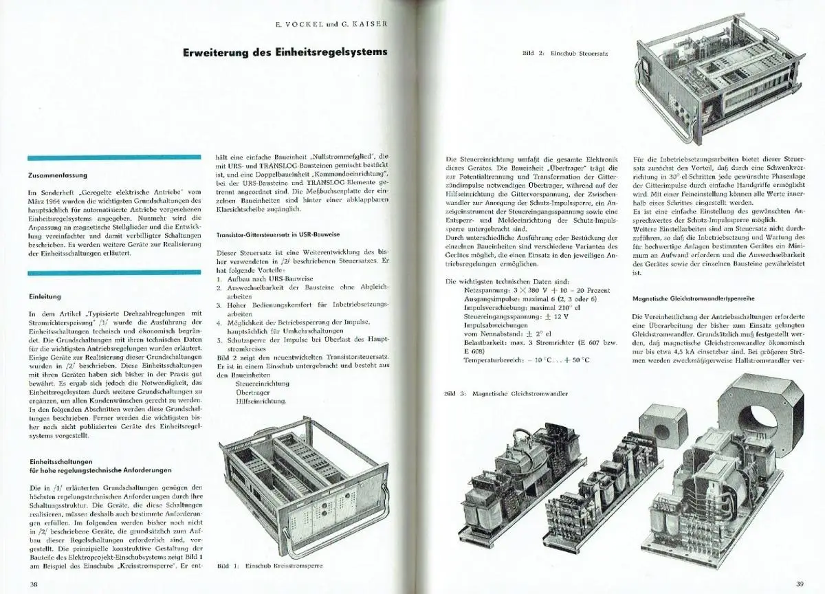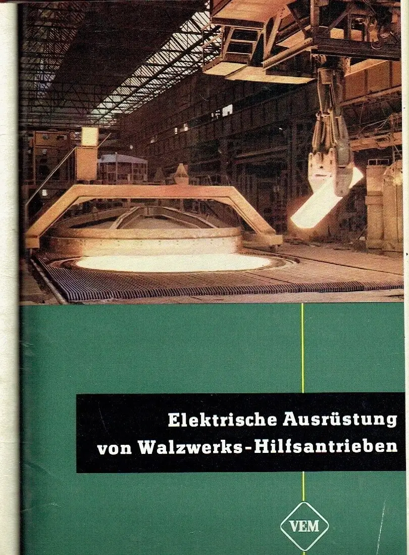 sehr guter Zustand, geringe Gebrauchs- und Alterungsspuren: privat gebunden - die ersten 4 Blatt etwas knittrig - Titel und Rückseite des ersten Prospektes etwas berieben / beschabt - dritter Prospekt etwas vergilbt - alle Seiten sauber und ordentlich - Titel vom ersten Heft an der oberen Ecke repariert, Antriebe und Steuerungen kontinuierlicher Feineisenstrassen (März 1959, 60 Seiten mit einigen Bildern) - Elektrische Ausrüstung von Walzwerks-Hilfsantrieben (März 1962, 86 Seiten mit zahlreichen Bildern) - Geregelte elektrische Antriebe (März 1964, 87 Seiten mit zahlreichen Bildern) - Stromrichter und Antriebe (März 1965, 93 Seiten mit zahlreichen Bildern)als Beispiel das Inhaltsverzeichnis von Heft 1 und 4: - Technologie der „Kontistraßen" im allgemeinen und Anforderungen an ihre elektrischen Ausrüstungen Von G. Kuntz, VEB Elektroprojekt, Berlin - Beschreibung einer ausgeführten kontinuierlichen Feineisenstraße und einer kontinuierlichen Drahtstraße Von F. Schwennicke und M. Seifert, VEB Elektroprojekt, Berlin - Stromrichterspeisung von Hauptantriebsmotoren in kontinuierlichen Walzenstraßen Von H. Schulze und W. Spiegel, VEB Elektroprojekt, Berlin - Walzmotoren für kontinuierliche Walzenstraßen Von H. Scheck, VEB Elektromaschinenbau Sachsenwerk, Dresden-Niedersedlitz - Hilfsantriebe in kontinuierlichen Walzenstraßen Von F. Schwennicke und M. Seifert, VEB Elektroprojekt, Berlin - Stromrichtergespeiste Hilfsantriebe Von A. Heimann und H.-D. Eggert, VEB Elektroprojekt, Berlin - Scheren in kontinuierlichen Walzenstraßen Von W. Brandt und A. Hüttig, VEB Elektroprojekt, Berlin - Betriebsverhalten von Stromrichteranlagen Von H. Kabisch, VEB Elektroprojekt Berlin - Kurzschlußberechnung in Stromrichteranlagen Von L. G. R. Beck, VEB Elektroprojekt Berlin - Geregeltes Steuerstromversorgungsgerät für Schienentriebfahrzeuge Von G. Schmidt, VEB Elektroprojekt Berlin - Silizium-Gleichrichter-Anlagen für Traktion Von E. Stolz und G. Sittnick, VEB Elektroprojekt Berlin - Siliziumgleichrichter für Elektrolysen und Industrieanlagen Von H. Wischer und M. Gawendowicz, VEB Elektroprojekt Berlin - Stromregelung von Elektrolysen Von P. Bernert, VEB Elektroprojekt Berlin - Erweiterung des Einheitsregelsystems Von E. Vöckel und G. Kaiser, VEB Elektroprojekt Berlin - Hochwertige Drehzahlgeber und ihre Ankupplung Von J. Köster, VEB Elektroprojekt Berlin - Die elektrische Ausrüstung von Kunststoffkalandern Von A. Hüttig, VEB Elektroprojekt Berlin - Erregung von Synchronmaschinen mit Stromrichtern Von H. Wolf, VEB Elektroprojekt Berlin - Der Einanodenstromrichter ELS 120/2,5 als Bremsschalter Von H. Schulze, VEB Elektroprojekt Berlin - Digitale Relegung elektrischer Antriebe Von G. Hentschel und H. G. Pranskat, VEB Elektroprojekt Berlin - Steuerbare Si-Gleichrichter — Thyristoren — für elektrische Antriebe Von G. Uhlenhut, VEB Elektroprojekt Berlin - Diskontinuierliche Regelung von Drehstrommotoren Von J. Bensch, VEB Elektroprojekt Berlin - Der Drehstromasynchronschleifringläufermotor in der Betriebsweise als untersynchrone Stromrichterkaskade — eine wirtschaftliche Antriebsmaschine für kontinuierliche Antriebe mit begrenztem Drehzahlstellbereich Von E. Krüger, VEB Elektroprojekt Berlin - Führungseinrichtungen für Wechselrichter mit Gleichstromzwischenkreis zur Speisung von Asynchronmotoren Von M. Kronberg, Technische Universität Dresden, Halbkunstleder, ca. 21 x 29, 326 Seiten mit zahlreichen Bildern