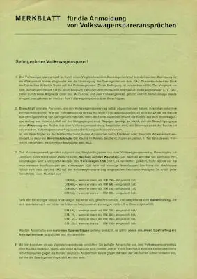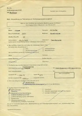 VW Formular Anmeldung zur Teilnahme am VW-Sparervergleich 1963