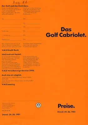 VW Golf 1 Cabriolet Preisliste 6.1981