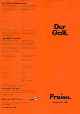 VW Golf 1 Preisliste 12.1981