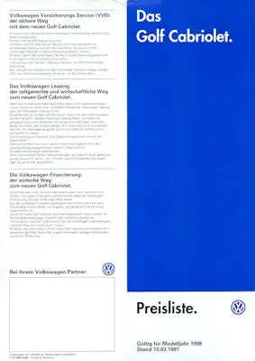 VW Golf 3 Cabriolet Preisliste 3.1997