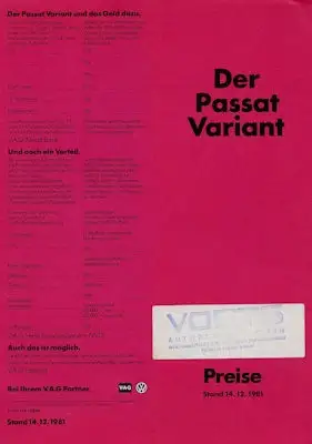 VW Passat B 2 Variant Preisliste 12.1981