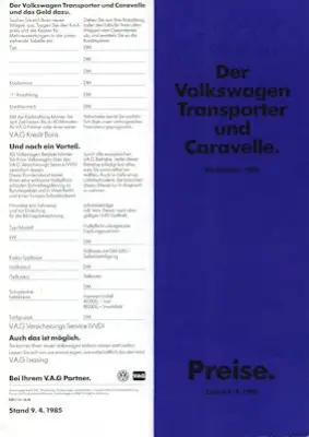 VW T 3 Transporter / Caravelle Preisliste 4.1985