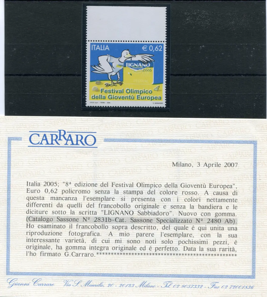 Sorte Möwe rosa Vollgummi - MHN - - 2005 Olympisches Jugendfest Nr. 2831 wunderschönes Exemplar b. von f. ohne gelben Farbdruck - Naturmarke Möwe rosa (Sass. spec. Nr. 2480 Aa) - Cert. Carraro - Kat. euro 6.000 Cod. 884/14