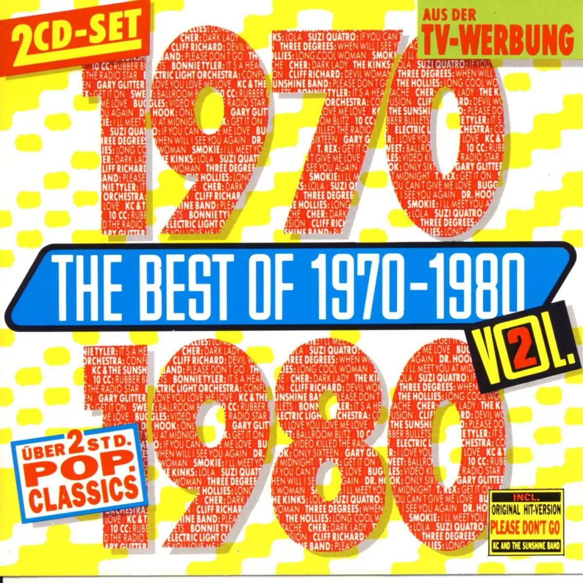 2x CD Album Various - Best Of 70-80 Vol. 2, Zustand CD VG+ Hülle VG+; Made in Germany 1992 EMI Electrola 0777 7 80355 2 7, Tracks The Sweet - The Ballroom Blitz 4:02, Middle Of The Road - Sacramento A Wonderful Town 2:48, Gary Glitter - I Love You Me Love 3:11, T. Rex - Get It On 4:25, Thin Lizzy - Whiskey In The Jar 3:44, Melanie - Ruby Tuesday 4:41, Leo Sayer - One Man Band 3:36, The Hollies - Long Cool Woman In A Black Dress 3:18, The Fortunes - Here Comes That Rainy Day Feeling Again 2:48, Tavares - Heaven Must Be Missing An Angel 3:35, 10cc - Rubber Bullets 4:43, Hotlegs - Neanderthal Man 4:19, Cher - Dark Lady 3:25, Brian Hyland - Gypsy Woman 2:32, The Kinks - Lola 4:05, Bonnie Tyler - It's A Heartache 3:52, The Move - Tonight 3:19, Cliff Richard - Devil Woman 3:36, KC & The Sunshine Band - Please Don't Go 3:50, The Three Degrees - When Will I See You Again 2:57, Dr. Hook - Only Sixteen 2:47, Exile - You Thrill Me 3:18, Albert Hammond - The Free Electric Band 3:25, Bo Donaldson & The Heywoods - Billy Don't Be A Hero 3:25, Andy Kim - Be My Baby 2:53, The Buggles - Video Killed The Radio Star 4:10, Pilot - Magic 3:02, The Real Thing - You To Me Are Everything 3:22, Smokie - I'll Meet You At Midnight 3:14, Electric Light Orchestra - Confusion 3:42, The Marmelade - Rainbow 3:12, Carpenters - Yesterday Once More 3:50, Christie - Yellow River 2:44, Gilbert O'Sullivan - Get Down 2:39, Suzi Quatro - If You Can't Give Me Love 3:55, The Rubettes - Sugar Baby Love 3:30
