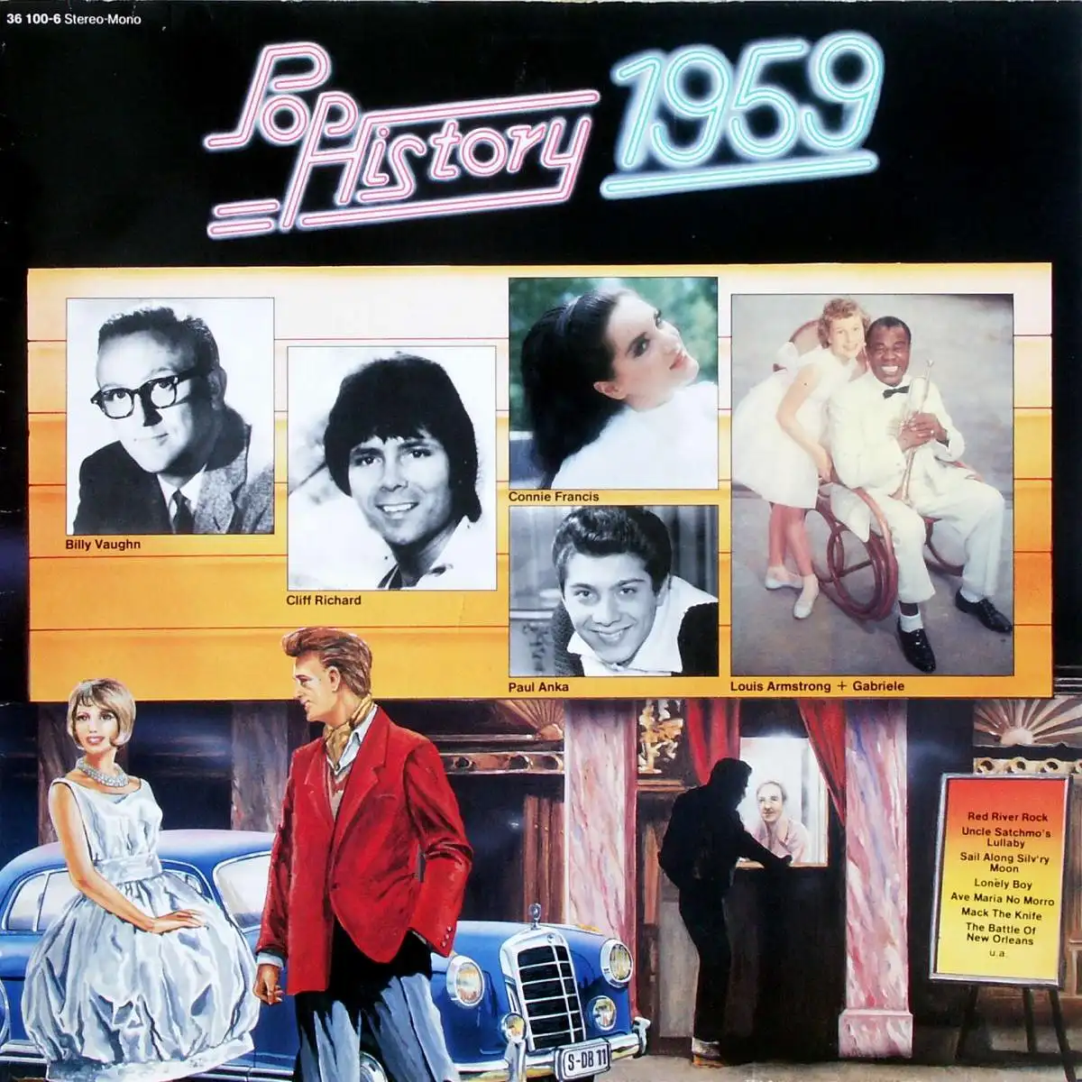 LP Album Various - Pop-History 1959, Zustand Platte VG+ Hülle VG+; Made in Germany 1986 Sonocord 36 100-6, Tracks Johnny Horton - The Battle Of New Orleans 2:31, Bobby Darin - Mack The Knife 2:57, David Whitfield - Cara Mia 3:08, Marty Robbins - El Paso 4:01, Johnny And The Hurricanes - Red River Rock 2:13, Connie Francis - Among My Souvenirs 2:28, Billy Vaughn - Sail Along Silv'ry Moon 2:07, Vera Lynn - Auf Wiederseh'n Sweetheart 2:35, Cliff Richard - Livin', Lovin' Doll 2:06, Paul Anka - Lonely Boy 2:25, Frankie Avalon - Just Ask Your Heart 2:20, Louis Armstrong + Gabriele - Uncle Satchmo's Lullaby 2:25, Conway Twitty - Mona Lisa 2:24, Anthony Newley - Idle Rock-A-Boggie 1:36, Lloyd Price - Personality 2:55, Trio San José - Ave Maria No Morro 5:50
