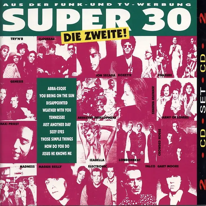 2x CD Album Various Artists - Super 30 Die Zweite, Zustand CD VG+ Hülle VG+; Made in Germany 1992 Ariola 74321 10980 2, Tracks Roxette - How Do You Do 3:11, Erasure - Take A Chance On Me 3:44, Londonbeat - You Bring On The Sun 3:36, Arrested Development - Tennessee 4:42, TN'T Partyzone - Vamos A La Playa '92 3:36, Ranks, Shabba - Mr. Loverman 3:36, Try 'n' B - Sexy Eyes 3:53, Maxi Priest - Groovin' In The Midnight 4:10, Army Of Lovers - Judgement Day 3:57, Izabella - I Write You A Love Song 3:40, Christie, Tony - You Are My Darling 3:58, Electronic - Disappointed 4:21, Falco - Titanic 3:37, Right Said Fred - Those Simple Things 3:27, Culture Club - Do You Really Want To Hurt Me 4:22, Genesis - Jesus He Knows Me 4:17, Secada, Jon - Just Another Day 4:15, Crowded House - Weather With You 3:44, Warnes, Jennifer - Rock You Gently 4:20, Madness - My Girl 2:44, Dolby, Thomas - Close But No Cigar 4:05, Moore, Gary - Separate Ways 4:40, Cutting Crew - If That's The Way You Want It 4:06, Hasselhoff, David - Everybody Sunshine 3:57, Smokie - Dont't Play That Game With Me 4:06, Clouseau - Louise 3:26, Reilly, Maggie - Wait 3:51, Chyp-Notic - Still In Love With You 4:02, Hawkins, Sophie B. - Damn I Wish I Was Your Lover 4:08, Lightning Seeds - Sense 4:10