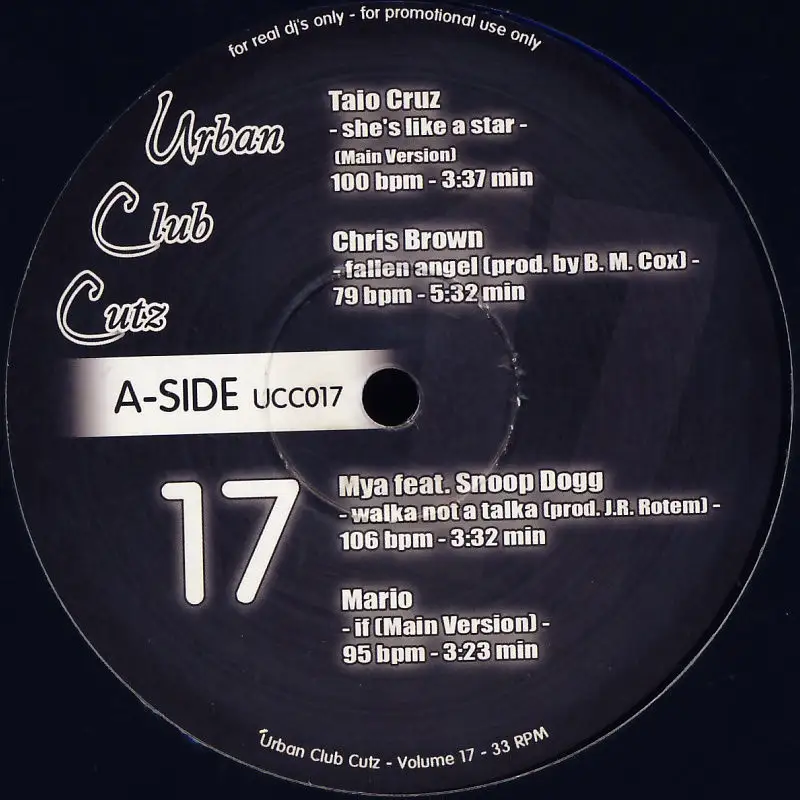 LP Album Various - Urban Club Cutz 17, neutrales Cover mit Info-Aufkleber, Zustand Platte VG+ Hülle VG+; Made in United States 2007 Urban Club Cutz UCC017, Tracks Taio Cruz - She's Like A Star [Main Vers.] 3:37, Chris Brown - Fallen Angel 5:32, Mya feat. Snoop Dogg - Walka Not A Tralka 3:32, Mario - If [Main Vers.] 3:23, Pitbull feat. Lil' Jon - The Anthem [Main Vers.] 4:10, Sean Paul feat. Left Side - Back It Up 3:02, Too Short feat. Dolla Will, Lil Red & Worm G - Let Em Fight [Dirty] 5:25, Cassidy feat. Eve & Bone Thugs-N-Harmony - Cash Rulez [Dirty] 3:53