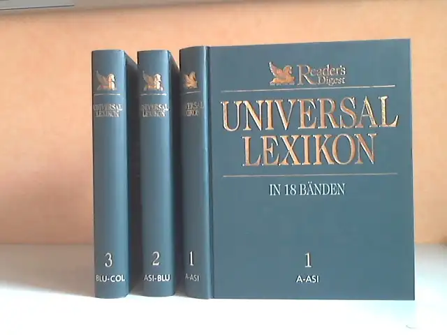 Seiten teils leicht fleckig, alle 3 Bücher sind altersbedingt in einem gutem, gebrauchten Zustand, In diesen 3 Bänden des `Universal Lexikon` von Reader´s Digest steckt viel Wissen, in alphabetischer Reihenfolge sortiert, für jeden gut leserlich und verständlich dargestellt. 3i3b Antiquariat Ardelt