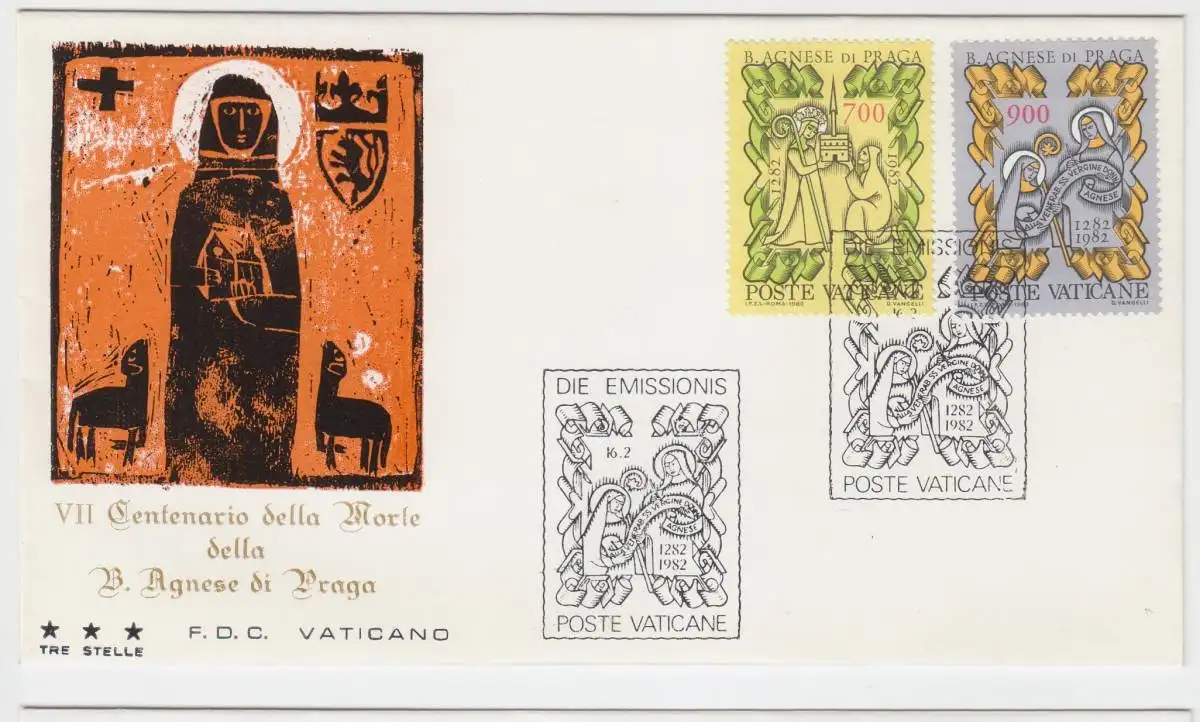 FDC: 700. Todestag der seligen Agnes von Böhmen: Sel. Agnes von Böhmen übergibt Ordenskirche an Großmeister der Kreuzherren / Sel. Agnes von Böhmen erhält von der hl. Klara einen Brief