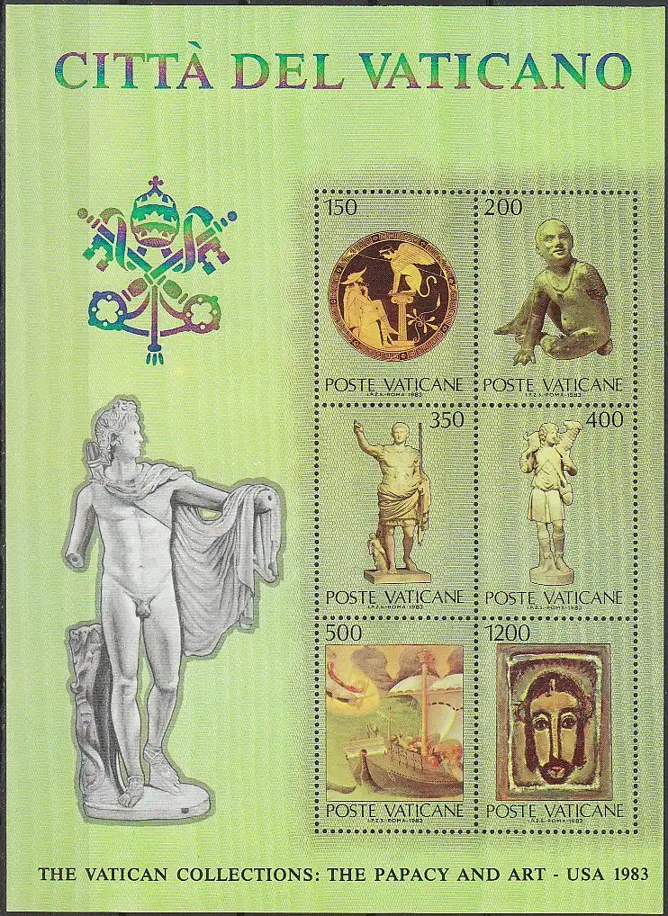 Blockausgabe: Ausstellung vatikanischer Kunstwerke in den Vereinigten Staaten von Amerika (III): Ödipus und der Sphinx (griechische Schale) / Kind (etruskische Bronzestatue) / Kaiser Augustus (Marmorstatue) / Guter Hirte (Marmorstatue) / Hl. Nikolaus rettet ein Schiff; Gemälde von Gentile da Fabriano / Das Heilige Antlitz; Gemälde von Georges Rouault (1871-1958)
