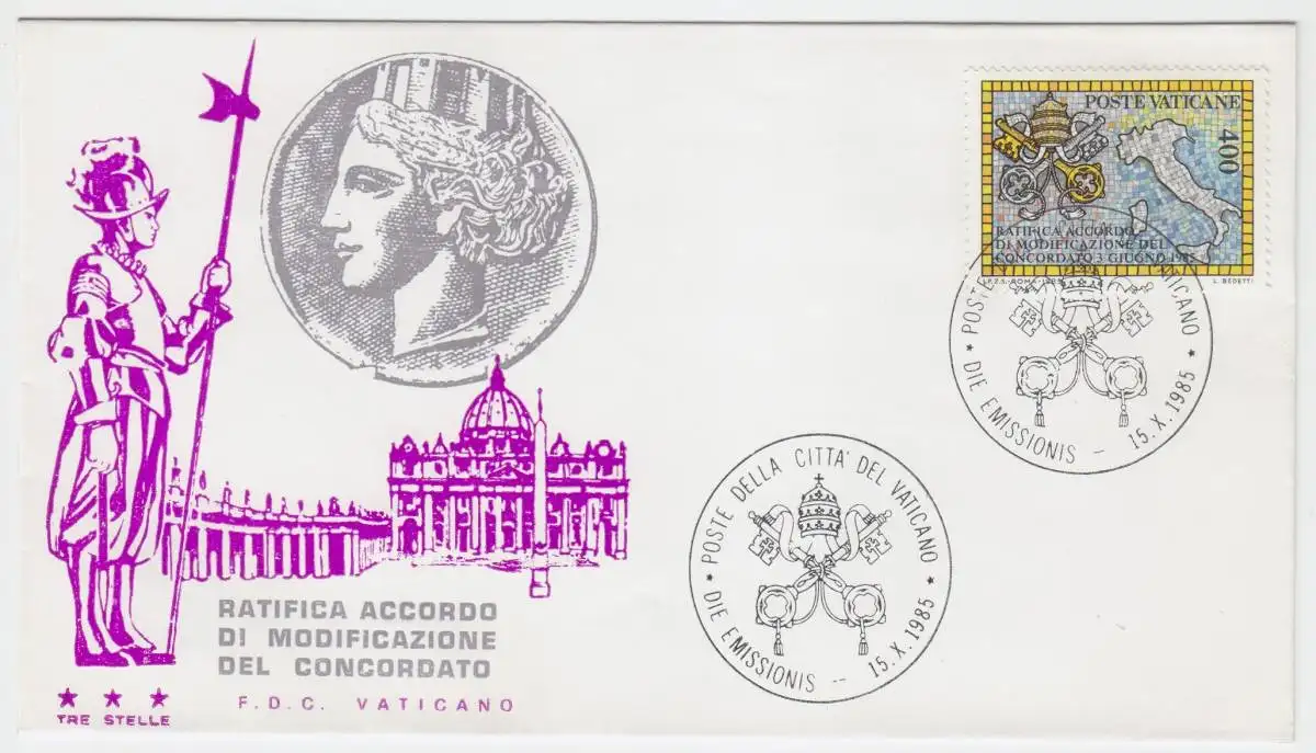 FDC: Neues Konkordat mit Italien: Päpstliches Wappen, Landkarte Italiens