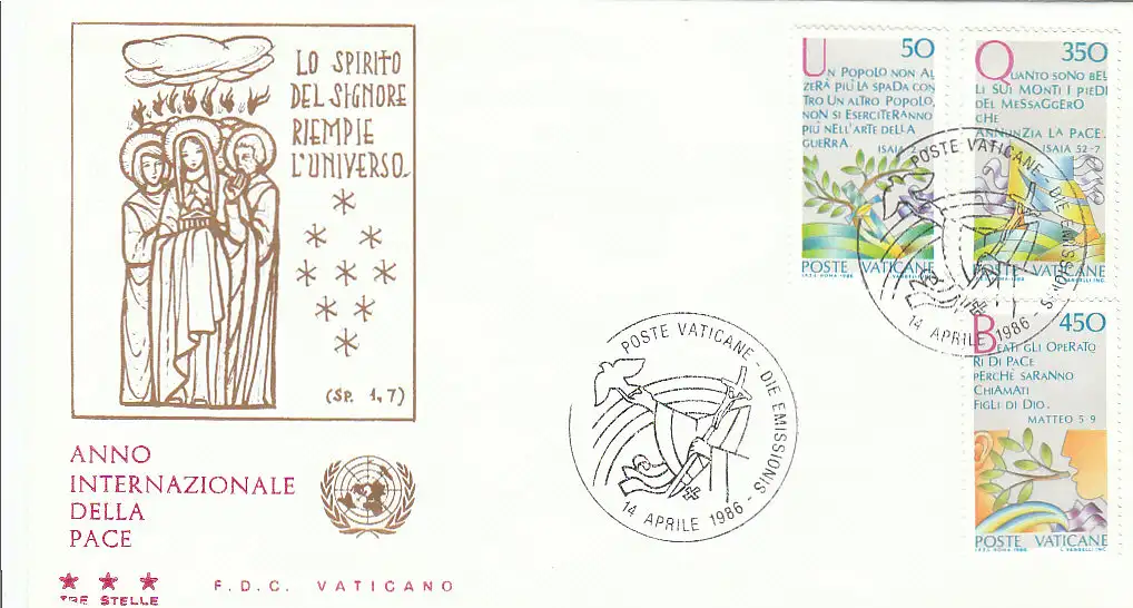FDC: Internationales Jahr des Friedens: Schwert mit Ölbaumzweig / Friedensbote / Menschen, Ölzweig