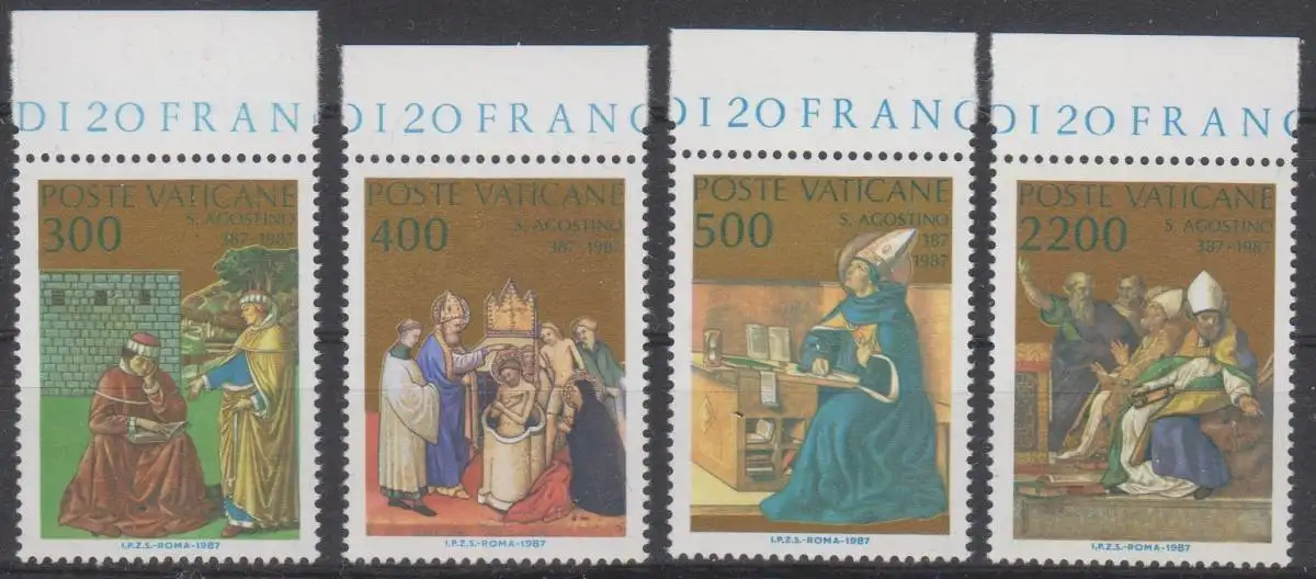 1600. Jahrestag der Bekehrung und Taufe des hl. Augustinus (354–430), Kirchenlehrer: Hl. Augustinus liest Apostelbrief; Fresko von Benozzo Gozzoli (1420-1497) / Taufe des hl. Augustinus; Gemälde von Bartolomeo di Gentile (1470-1534) / Ekstase des hl. Augustinus; Fresko von Benozzo Gozzoli / Disputa; Fresko von Raffael (1483-1520)