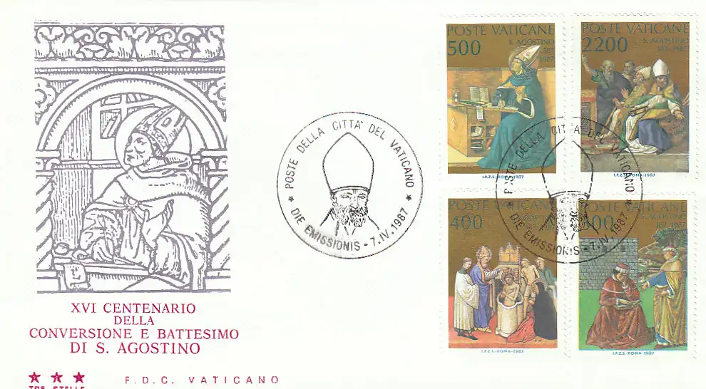 1 FDC: 1600. Jahrestag der Bekehrung und Taufe des hl. Augustinus (354–430), Kirchenlehrer: Hl. Augustinus liest Apostelbrief; Fresko von Benozzo Gozzoli (1420-1497) / Taufe des hl. Augustinus; Gemälde von Bartolomeo di Gentile (1470-1534) / Ekstase des hl. Augustinus; Fresko von Benozzo Gozzoli / Disputa; Fresko von Raffael (1483-1520)