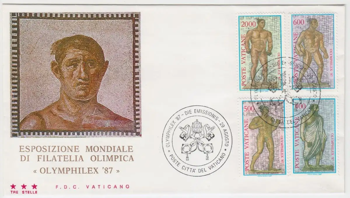 1 FDC: Internationale Briefmarkenausstellung OLYMPHILEX ’87, Rom: Teile des Fußbodenmosaiks der Caracalla-Thermen: Richter / Athlet / Athlet / Athlet