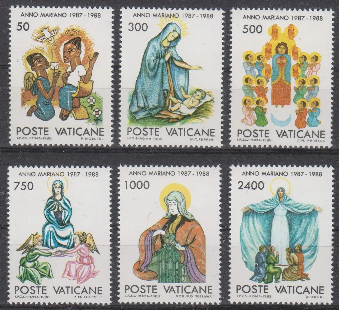 Marianisches Jahr (1987–1988): Gemälde: Mariä Verkündigung; von P. Eugene Woelfel / Christi Geburt; von Maria Carmela Perrini / Pfingsten; von Anna Maria Maresca / Aufnahme Mariens in den Himmel; von Maria Maddalena Tuccelli (*1951) / Maria, Mutter der Kirche; von Nobuko Suezawa / Maria, Zuflucht der Sünder; von Rita Fantini