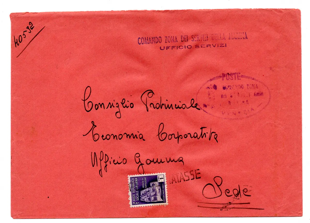 - Steuermarken von Venedig - Umschlag, der von Venedig in die Stadt versandt wird, der bei der Ankunft für 1 Lira besteuert wird, mit der Briefmarke Zerstörte Denkmäler Nr. 509, die mit der gedruckten linearen Briefmarke für Steuermarken storniert wurde - Interessante Nr. 332/18