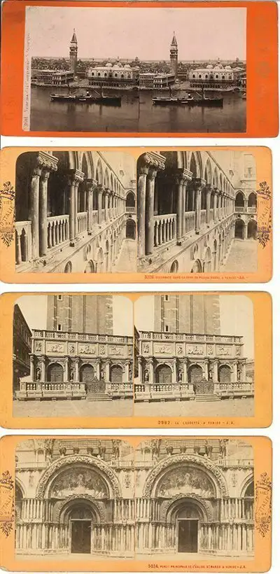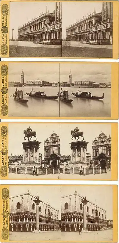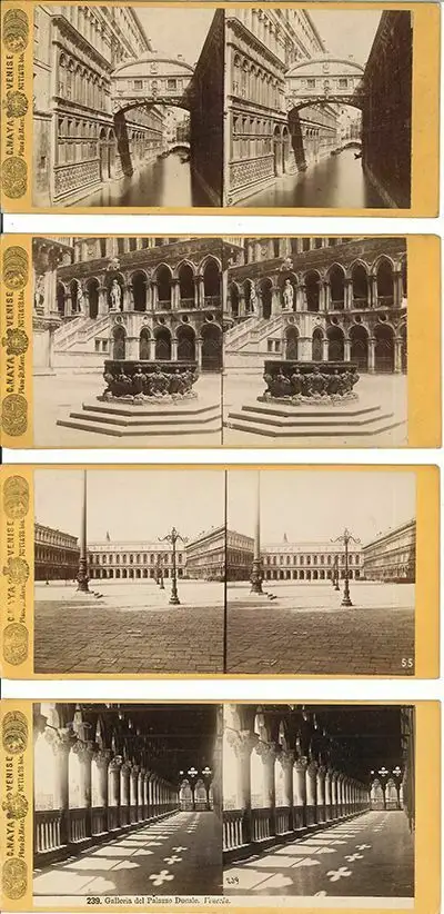 Venezia, L. Naya/Napoli, G. Sommer u. a. [ca. 1880]. 15 Orig.-Photographien (Albumen) zu je einer Stereophotographie auf Karton mont. je 8, 7 x 17, 6 cm. Auf Kart. mont. In gutem Zustand.