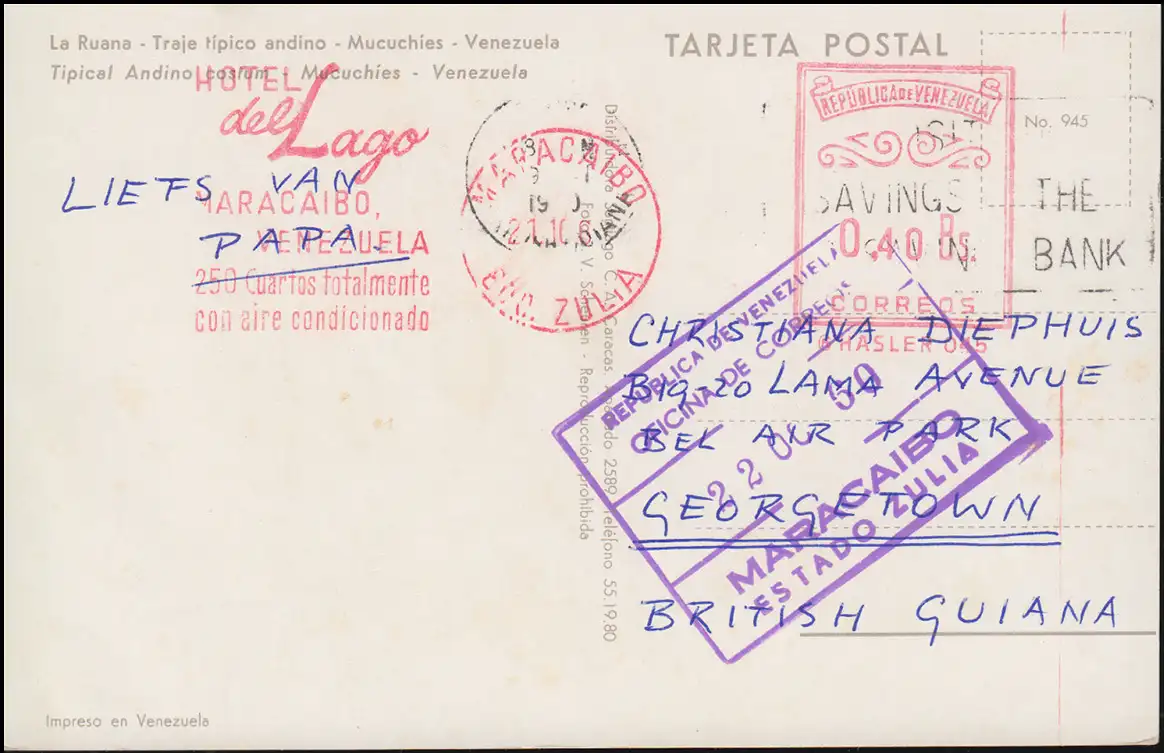Venezuela Absenderfreistempel Hotel del Lago MARACAIBO 21.10.60 AK Anden-Tracht