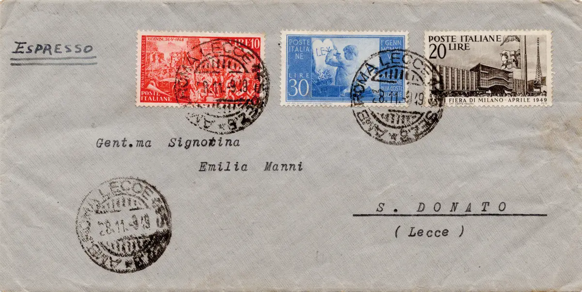 Umschlag - Verfassung Lire 30 Nr. 579 + Ergänzungen Nr. 585 + 598 auf Expressumschlag von Rom nach San Donato am 28.11.49 - im Tarif Cod. 280/17
