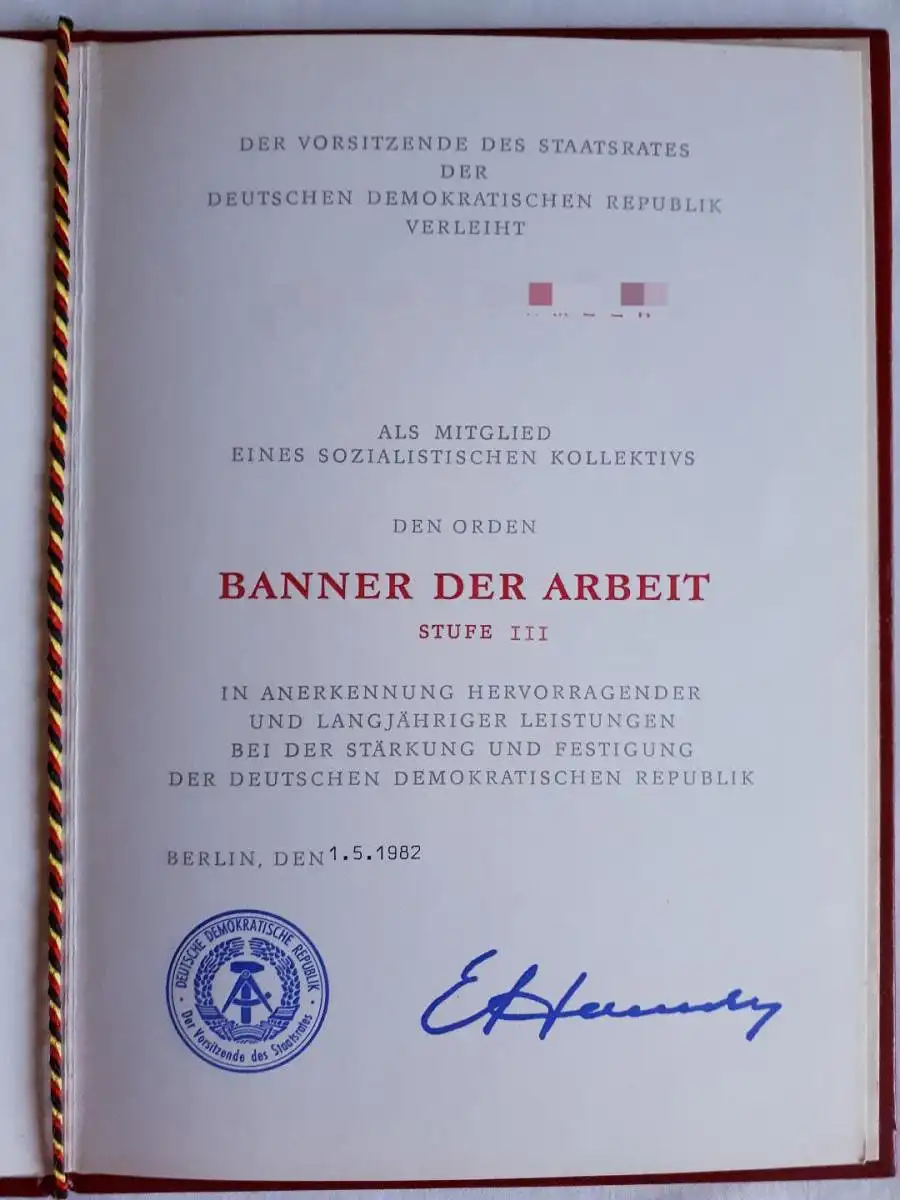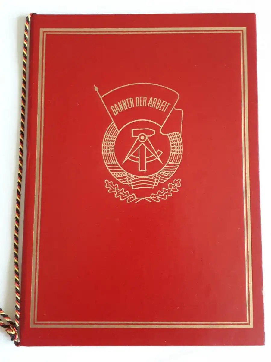 Verleihungsurkunde mit Mappe Banner der Arbeit 1982