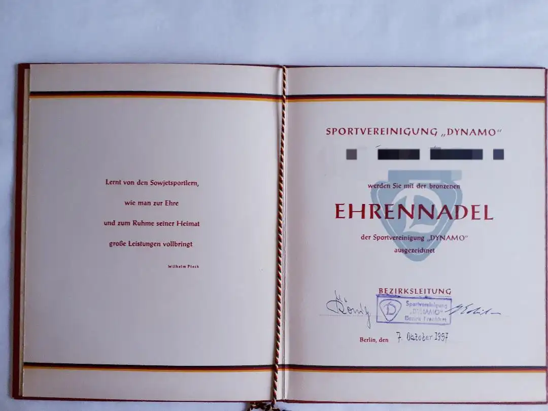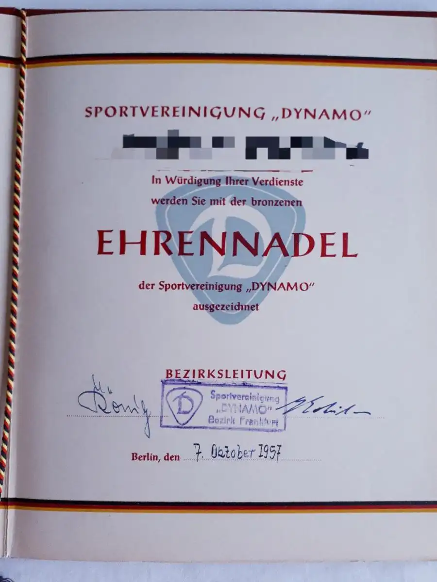 Verleihungsurkunde mit Mappe SV Dynamo Verleihungsjahr 1957