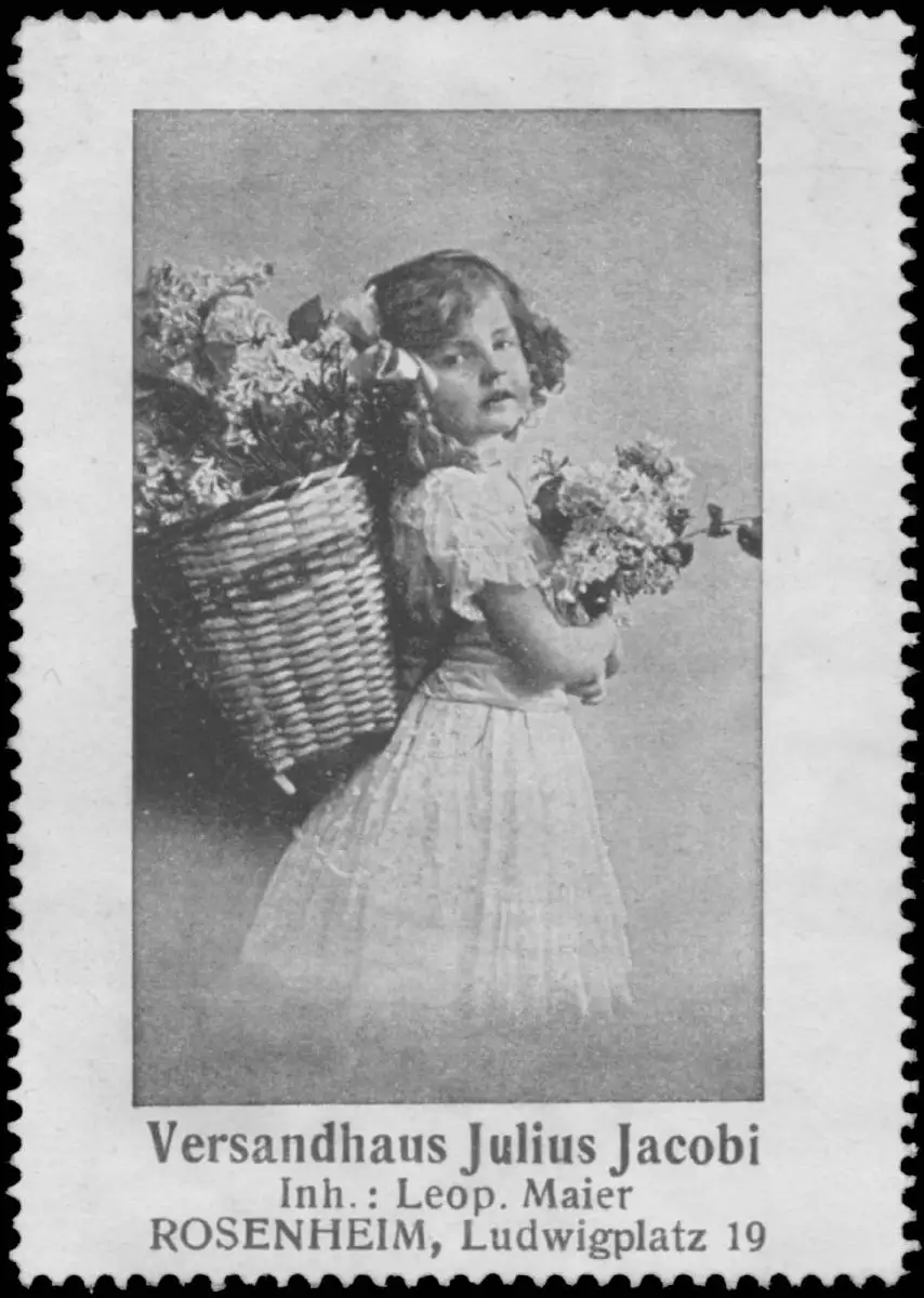 Kind mit Blumen, Inhaber: Leopold Maier, Ludwigsplatz 19, Größe/Zustand: 7x5 , guter Zustand, Original alte Reklamemarke die seinerzeit für die Werbung benutzt wurde