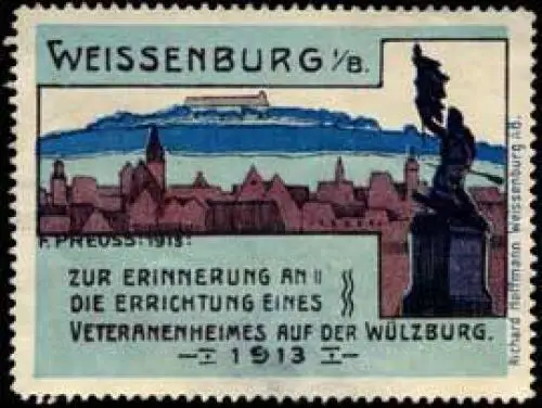 Zur Erinnerung an die Errichtung eines Veteranenheimes auf der Wülzburg, Weissenburg, Größe/Zustand: 5x6 , fleckig, Original alte Reklamemarke die seinerzeit für die Werbung benutzt wurde