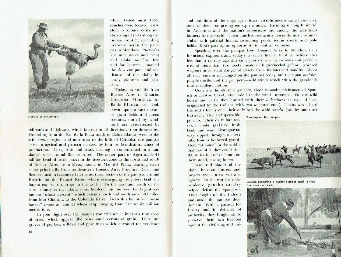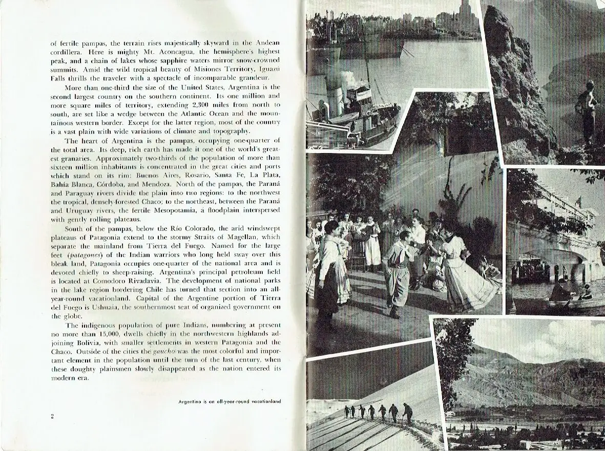guter Zustand, geringe Gebrauchs- und Alterungsspuren: Deckel am rechten Rand gering beschädigt und etwas zerknittert - Umschlag und Seiten teils etwas eselsohrig - Umschlag gering verschmutzt - Seiten sauber und ordentlich, Sketch of the past - Your trip to Argentina - How to get there - Travel within the country - What you will see - Buenos Aires - The Pampas - Short trips from Buenos Aires - Map of Argentina - Mar del Plata - Córdoba - The Andean Lake Region - Up the Paraná to Iguazú Falls - The Route to Chile - The Route to Bolivia - Extra-Curricular - Practical Informations, Softcover, ca. 15 x 22,5, 40 Seiten mit zahlreichen Bildern
