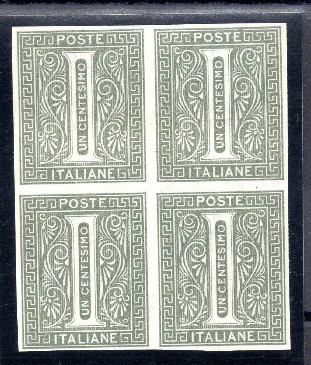 Vitt. Emanuele II. Cent. 1 Nr. P 14 Viertel der Archivprüfung Vollgummi - Vitt. Emanuele II. Cent. 1 Nr. P 14 Viertel des ungezahnten Archivbelegs auf weißem Papier mit filigraner Krone gedruckt - unmerkliche Falzung auf zwei Exemplaren - AD - Kat. 1.200 Code 121/8