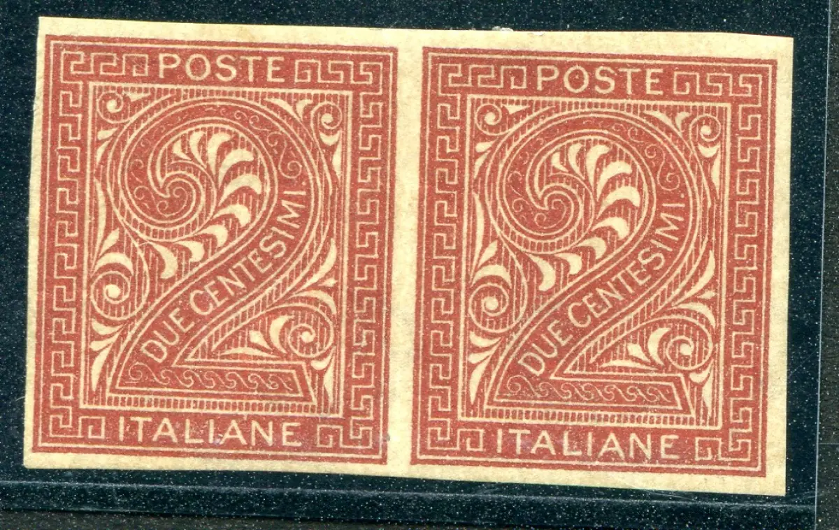 Vitt. Emanuele II. Cent. 2 Nr. T15d ungezähnte Paarsorte Mit Linguella Spur - Vitt. Emanuele II. Cent. 2 Nr. T15d ungezähntes horizontales Paar - Papierhaftungen auf Gummi - Kat. euro 400 Cod. 83/13