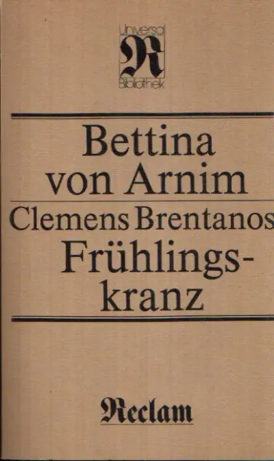 Von Arnim, Bettina; Clemens Brentanos Frühlingskranz; aus Jugendbriefen ihm geflochten, wie er selbst schriftlich verlangte; Briefe; Zur Entstehung des Frühlingskranzes; Zum Verhältnis des Frühlingskranzes zu den originalen Briefen; Die Beschlagnahme des Frühlingskranzes; Literaturverzeichnis; Zur Textgestaltung; Geschichten; Erzählungen