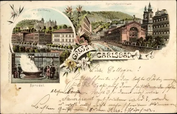 Vorläufer Litho Karlovy Vary Karlsbad Stadt, Kurhaus, Sprudelcolonnade, Sprudel