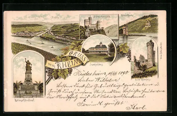 Vorläufer-Lithographie Bingen, 1895, Ortsansicht, Mäusethurm, Ruine Ehrenfels, National-Denkmal