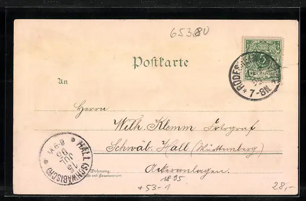 Personenbezogene Daten auf der Rückseite der Karte wurden durch blauen Textmarker unkenntlich gemacht. Die blauen Stellen sind auf die Vorderseite durchgeweicht und wirken sich negativ auf das Postkartenfoto aus