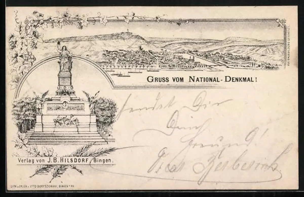 Vorläufer-Lithographie Bingen / Rhein, 1895, National-Denkmal und Panorama