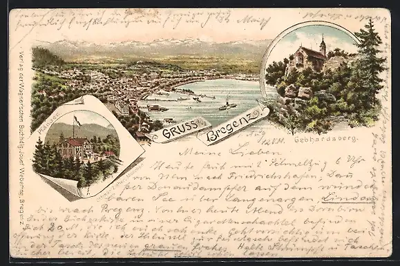 Vorläufer-Lithographie Bregenz, 1892, Gasthaus Pfänder, Gebhardsberg, Panorama