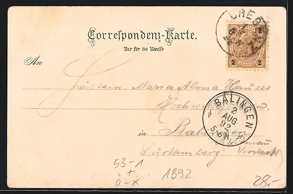 gelaufen 1892, Eckknicke li. oben und re. unten, guter Zustand