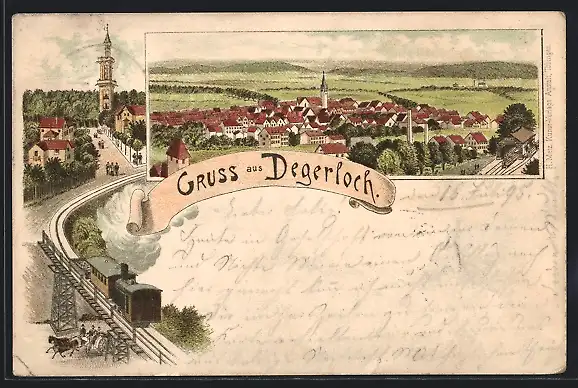 Vorläufer-Lithographie Degerloch, 1895, Zahnradbahn, Aussichtsturm, Ortsansicht