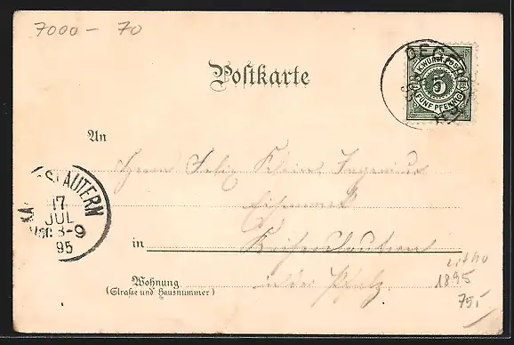 Personenbezogene Daten auf der Rückseite der Karte wurden durch blauen Textmarker unkenntlich gemacht. Die blauen Stellen sind auf die Vorderseite durchgeweicht und wirken sich negativ auf das Postkartenfoto aus