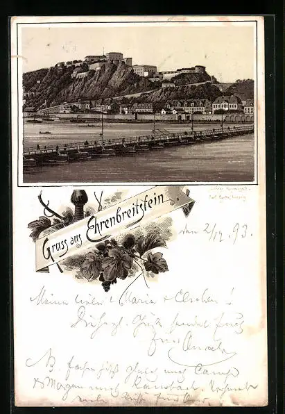 Vorläufer-Lithographie Ehrenbreitstein, Totalansicht mit Uferpartie 1893