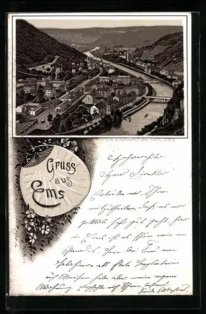 Vorläufer-Lithographie Ems, 1895, Totalansicht aus der Vogelschau