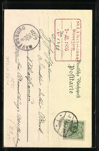Personenbezogene Daten auf der Rückseite der Karte wurden durch blauen Textmarker unkenntlich gemacht. Die blauen Stellen sind auf die Vorderseite durchgeweicht und wirken sich negativ auf das Postkartenfoto aus
