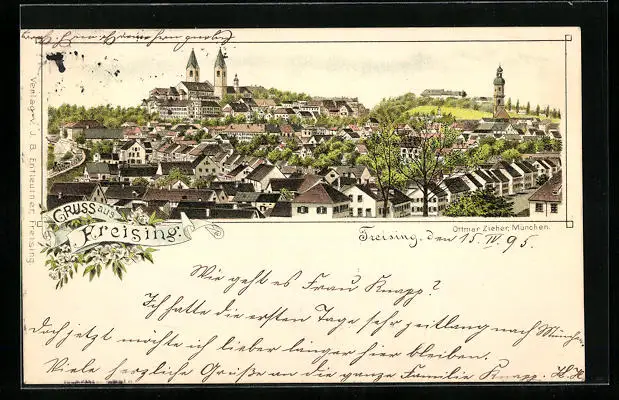 Vorläufer-Lithographie Freising, 1895, Totalansicht der Stadt