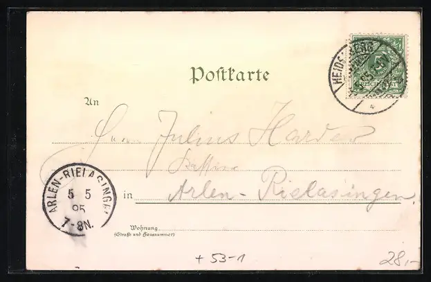 Personenbezogene Daten auf der Rückseite der Karte wurden durch blauen Textmarker unkenntlich gemacht. Die blauen Stellen sind auf die Vorderseite durchgeweicht und wirken sich negativ auf das Postkartenfoto aus