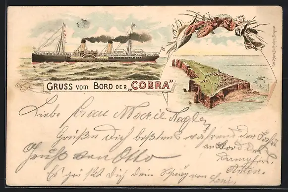 Vorläufer-Lithographie Helgoland, 1894, Dampfer Cobra auf See, Insel aus der Vogelschau