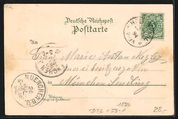 Personenbezogene Daten auf der Rückseite der Karte wurden durch blauen Textmarker unkenntlich gemacht. Die blauen Stellen sind auf die Vorderseite durchgeweicht und wirken sich negativ auf das Postkartenfoto aus