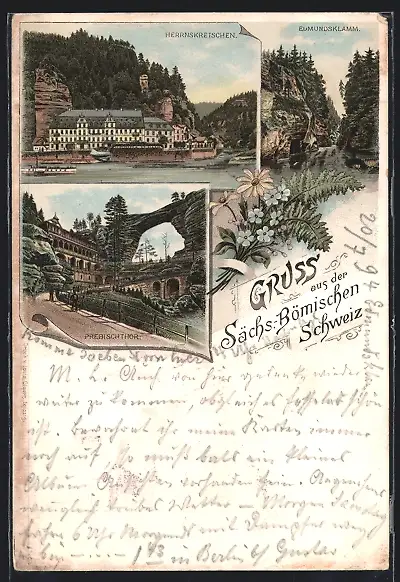 Vorläufer-Lithographie Herrnskretschen, 1894, Ortsansicht, Sächs.-Böhmische Schweiz, Prebischthor, Edmundklamm