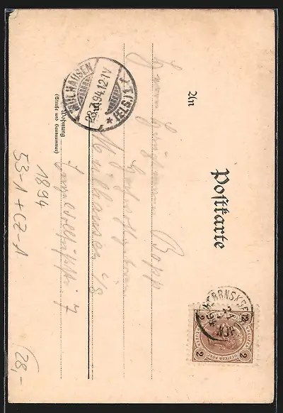 Personenbezogene Daten auf der Rückseite der Karte wurden durch blauen Textmarker unkenntlich gemacht. Die blauen Stellen sind auf die Vorderseite durchgeweicht und wirken sich negativ auf das Postkartenfoto aus